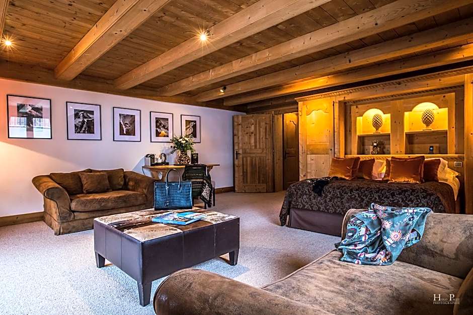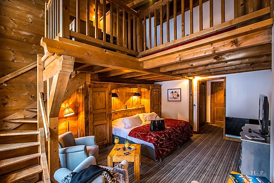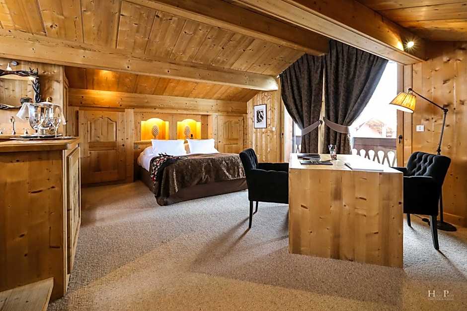 This south-facing room offers a seating area and a balcony with views of the village. It also includes access to the wellness area, with indoor and outdoor pools, a hot tub, hammam and sauna.