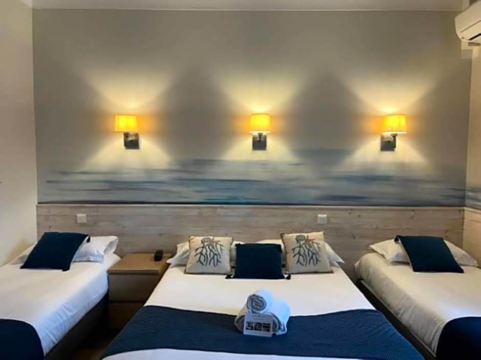 These triple rooms are located on the first floor. They feature a double bed and a single bed, and are decorated with a sunset theme.