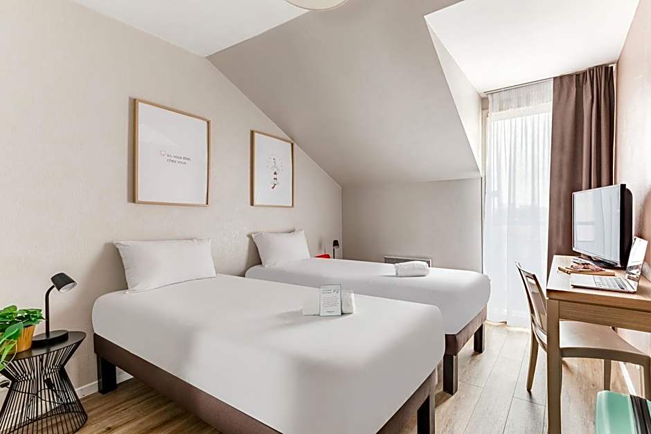 Very good position for Nantes and l'île, parking a leaving car in garage (11E/ day) worth it in hot weather. The apartments are fine inside, not air-conditioned but fans kindly left in the rooms. For the price a good option and 24 hour service desk especially helpful. Mezzanine breakfast area good with in and outdoor seating and lawned area