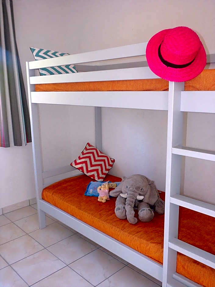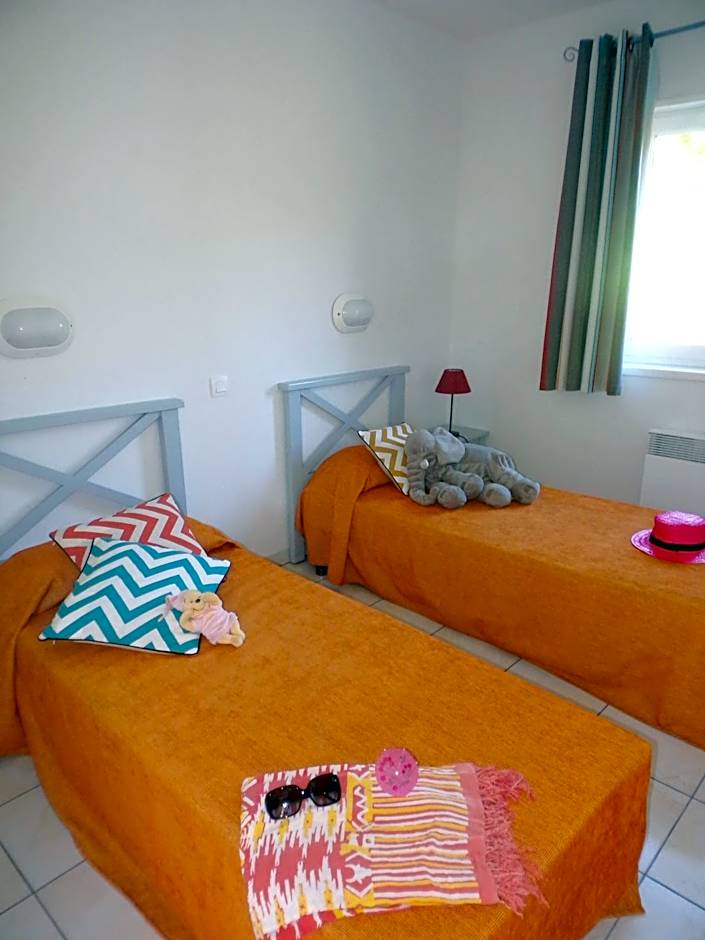 This villa has a bedroom with a double bed, a bedroom with two single beds and a bedroom with bunk beds. There is also a living are with a convertible sofa bed that sleeps two adults. The well-equipped kitchenette has a fridge and an oven. The private bathroom has a bath and a shower.