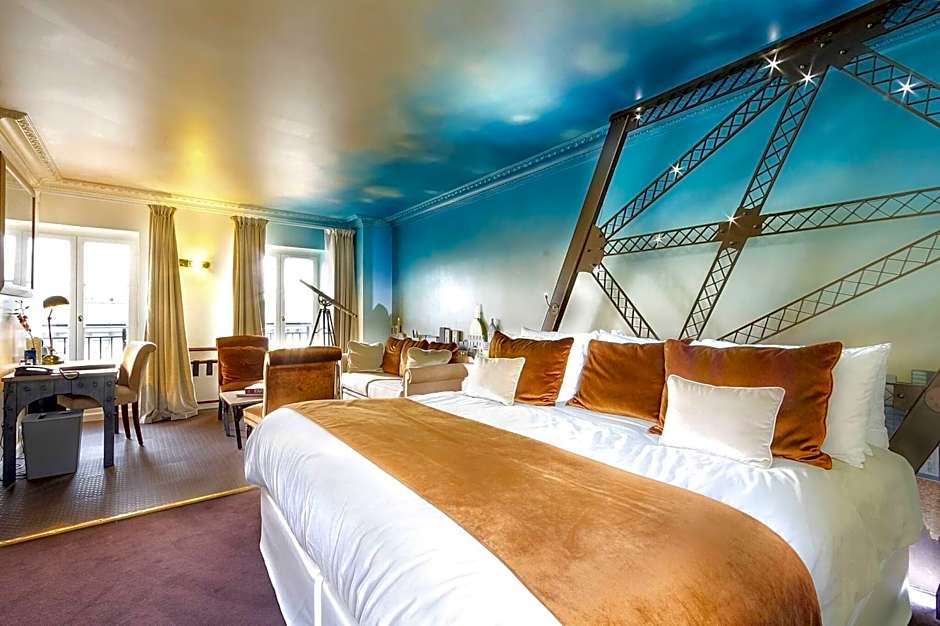 Spacious suite featuring a spa bath and a view of the Eiffel Tower.