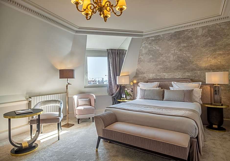 Spacious suite with a separate lounge area and spa bath or old style tub. The suite offers views of rue de Berri or the rooftops of Paris with a mansard roof.