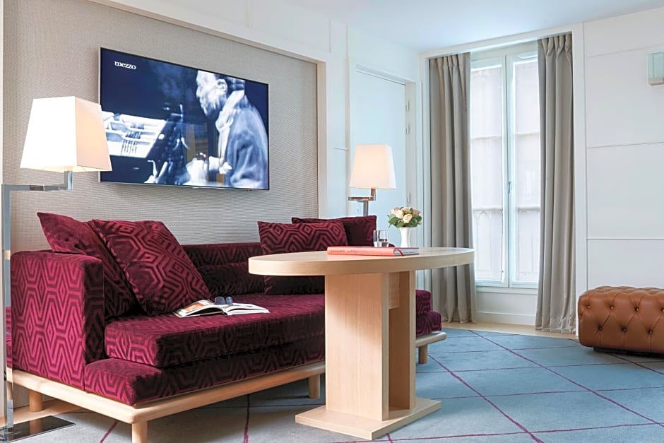 The suite has a living room with a sofa convertible into 2 separate beds and a bedroom with a balcony and a view of the Church of the Madeleine. The suite is equipped with an iPad that allows you to manage televisions, room temperatures, music and light moods. Apple TV which allows you to watch content from your Apple account. 2 televisions 55" with LED screen, USB sockets next to the bed. In the bathroom: a TV in the mirror and music, a bathtub and a large shower. Ultra-fast fiber optic WiFi.