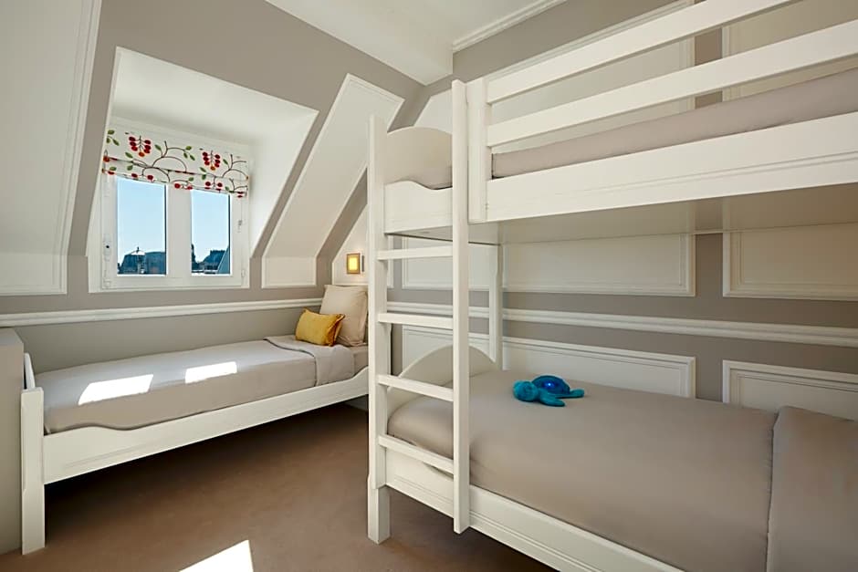 This suite is composed of two bedrooms : a large master bedroom and separate children’s bedroom with bunk beds, and a spacious living area. The bathroom provides a bathtub for young ones. The suite offers breathtaking view on the roofs of Paris.