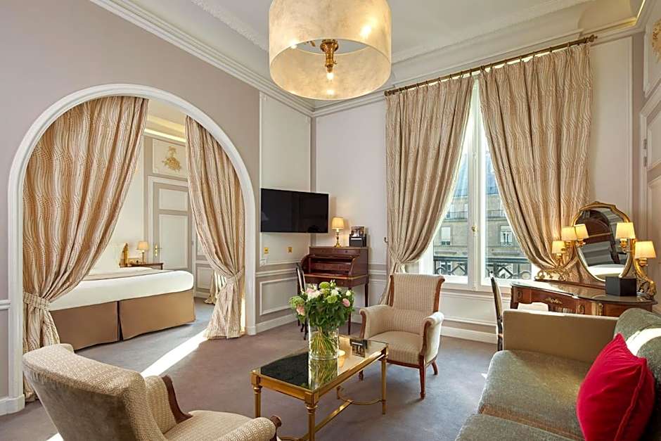 This suite features views of the Eiffel Tower, Louver Museum, Grand Palais glass roof and the Tuileries Gardens. Please state your preference for a double or twin bed configuration when booking, this is subject to availability. This room can accommodate a baby cot.