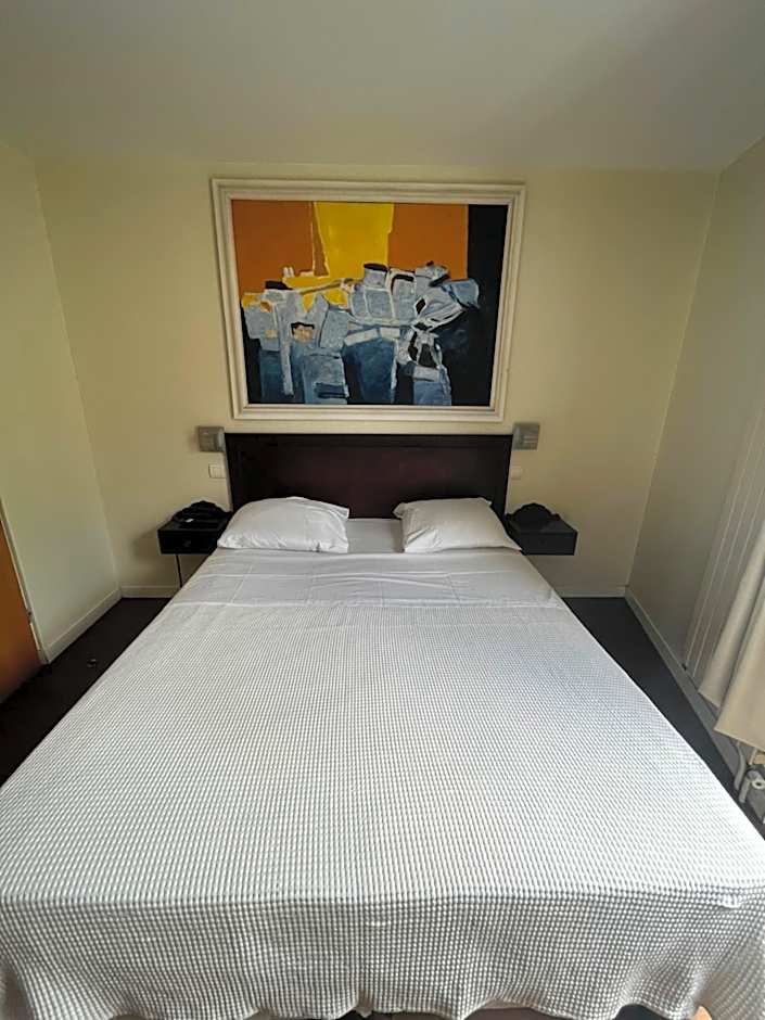 Excellent value for the money. Rooms have mini fridge, tv, comfortable bed. Even if our room was facing the main road, it was not nosiy. Nice bars and very good bulangerie downstairs.(1min walk) Metro station is at 3-5 min walk. The room size was really good compared to what Paris generally offers.