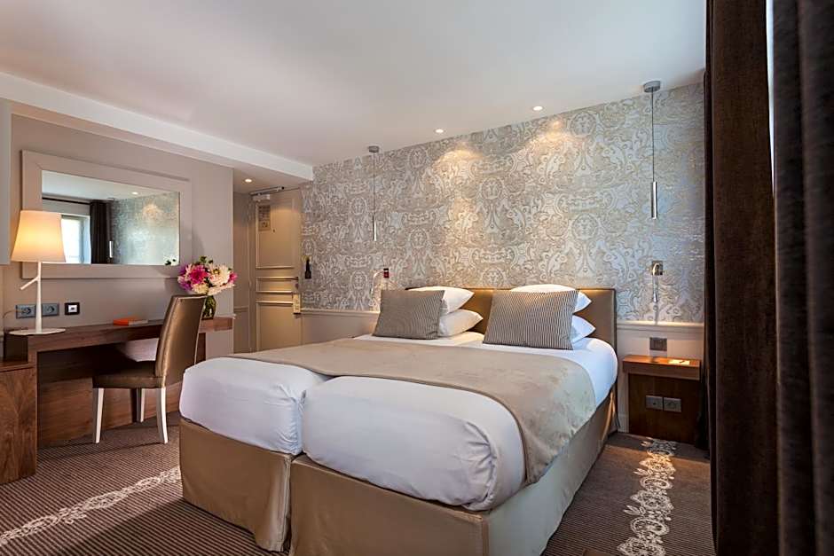 Really lovely hotel in a superb location. We had a superior twin room, with a view down to the central courtyard. The beds were comfy and the room a nice size. Good shower. Handy fridge with two bottles of water on arrival. Didn’t try breakfast as nice places to eat nearby. Staff were lovely. Nice touches like flavoured water and sweets at reception. The location, near the Luxembourg Gardens in St Germain De Pres, was perfect. Easy walking distance to the gardens, Musee de Cluny and lovely bars, cafes and restaurants. Notre Dame was a 15 minute walk away.