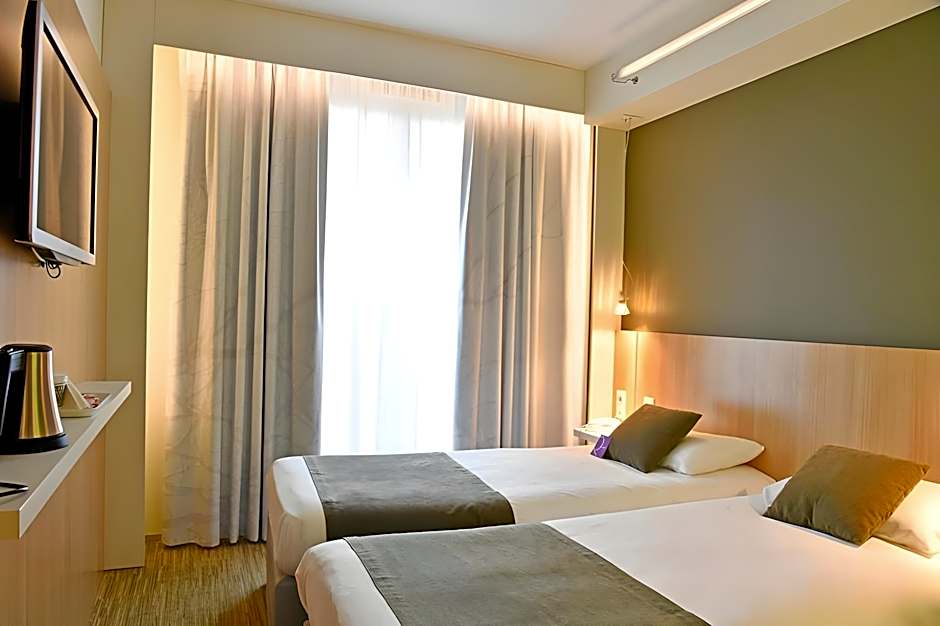 5 minute walk from Gare du Nord. Great spot if you plan to visit all areas of Paris. A trip to the southern parts can take a substantial amount of time. Reserve at least 1 hour for metro travel in that case. Shops of all sorts and restaurants are plenty, most of them in front and in the side streets of the station. The hotel is located just outside that busy area with at least 2 supermarkets between them. Bathroom in the basic room is small, with green perspex doors. OK for max 2 nights. Had a different room the next day which was a lot bigger, also had a bigger bathroom with a glass door in blue design and a better layout. Much better and a wiser choice for a longer stay (+2 days). Beds are still changed on a daily basis and used towels replaced. Breakfast is of the "American" style. Room on street-side overlooks the platforms from Gare de L'est so it is very close to both. As a result their station announcements can be heard as is the odd rumbling train. A closed balcony door eliminates those sounds quite well. Know that a city tax (13/night) needs to be paid upon arrival. It is not included in the price of the booking.