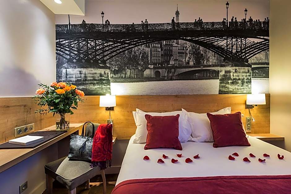 The man at the front desk was lovely. He helped us fit our stroller into the tiny elevator and then helped us get into the room so I didn't have to wake up my napping daughter. He double checked with us that our room was okay, and he went out of his way to learn our daughter's names. He was so friendly and kind, which really stood out in Paris. The location was good, near the train station and was perfect for our short stay. The room was comfortable and the bathroom was large and clean. We appreciated the big bathtub and mini fridge, and the lobby is decorated nicely.
