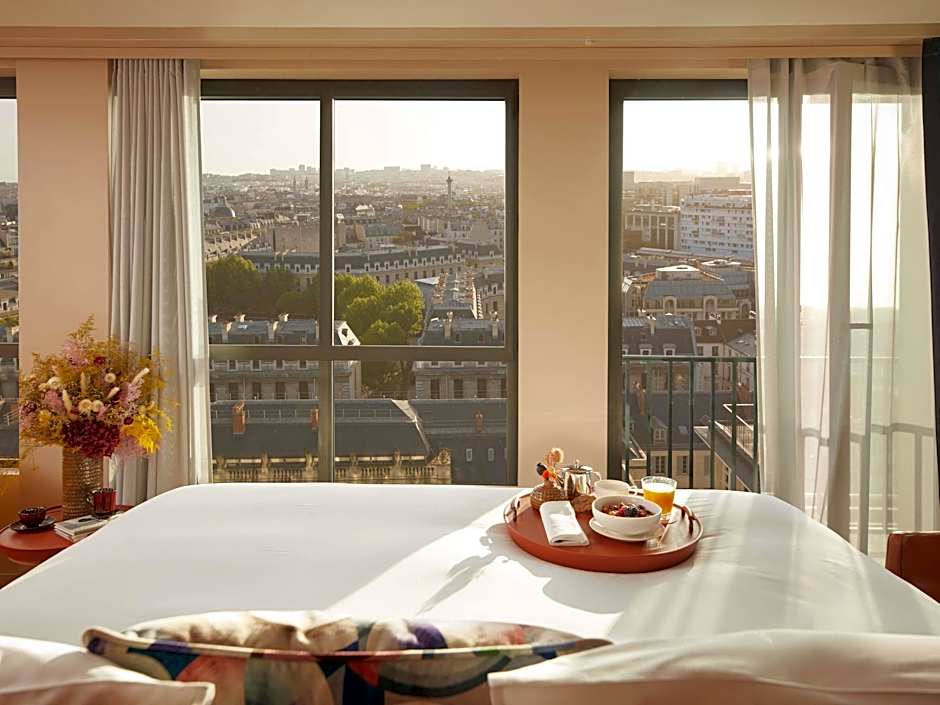 The SO Paris Hotel offers a variety of room types to choose from. These include suites such as the Studio Panorama Eiffel Tower view and the Studio, both of which have a room size of 463 sqft and can accommodate 3 adults and 2 children. The hotel also offers double rooms such as the Collection King Room with Courtyard View and the Iconic - Paris Skyline View Room with One King or Two Single Beds, which have a room size of 269 sqft and accommodate 2 adults and 1 child. Additionally, there is the Collection Rooftop View room with the same occupancy and room size. All rooms are non-smoking and have king size beds, with some also offering twin beds or a balcony.