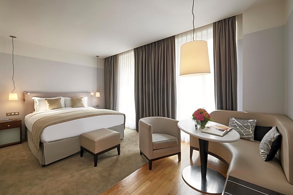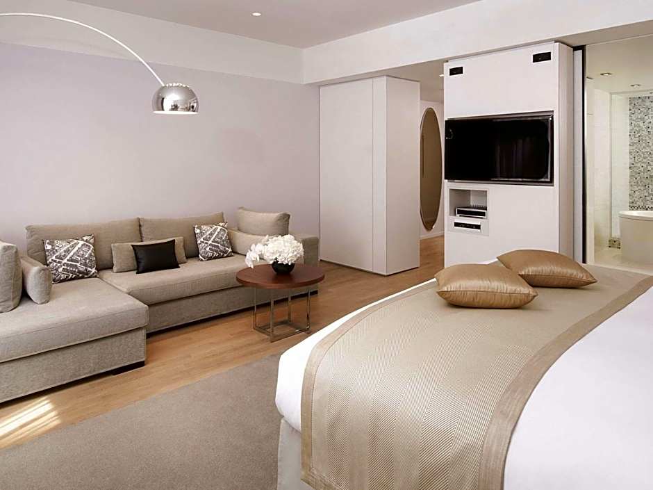 This larger room features unique details including: - Exclusive MyBed bedding concept - Balmain toiletries - mood lighting - Nespresso coffee machine - Hermès bath products - Room service menu by Chef Christian Constant - mini-bar with cold drinks
