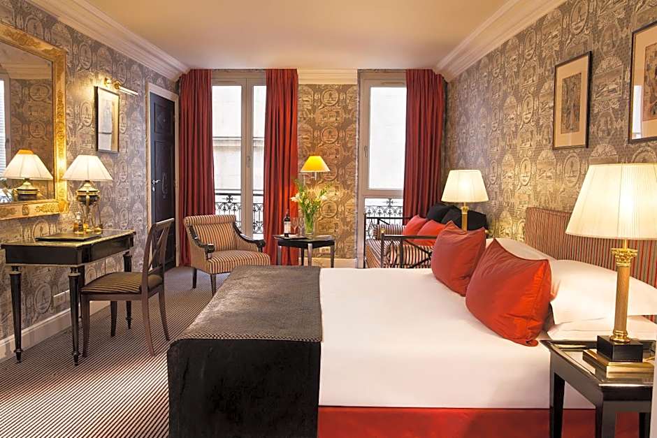 Decorated in a unique style with striped or patterned wall fabrics in bold colors, this spacious room features free WiFi, a king-size bed, a desk and a seating area. The private bathroom is equipped with a bathtub and extra features in the room include a safe, mini-bar and satellite TV.
