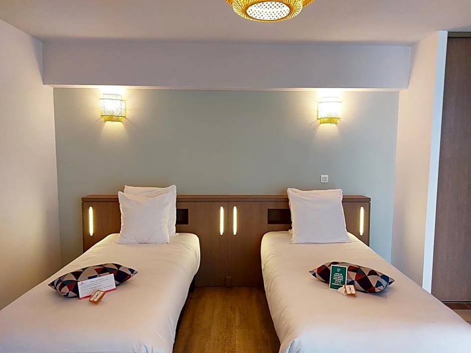 The staff went above and beyond to look after us. They were very kind and courteous and had excellent English to help out when our rusty French fell short! The breakfast was tasty and varied with yoghurt, meats, cheeses, baguette, scrambled/boiled egg, sausages, juices, cereals, etc. There was an option of cow's milk or soya milk for cereal to cater for those with intolerances. The room was stocked with coffee pods with extras and teabags available from reception and welcome cookies. It felt very safe as we had to return quite late and were buzzed in by reception in the early hours. The staff were all extremely helpful and efficient.