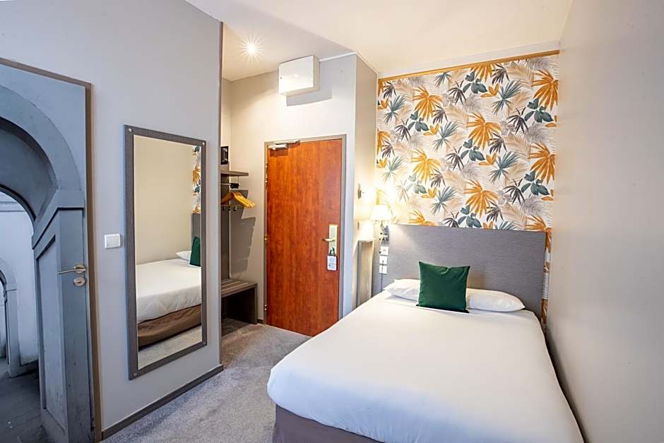 Location is great. Boulangeries, bars, restaurants, and supermarket, are all within walking distance. Staff was very friendly, and made good effort to communicate with me even though my French is terrible. My room (3rth floor) was dark and quiet. Public parking very close by. It was free for Saturday on Sunday night. Be warned, no parking on Saturday morning.