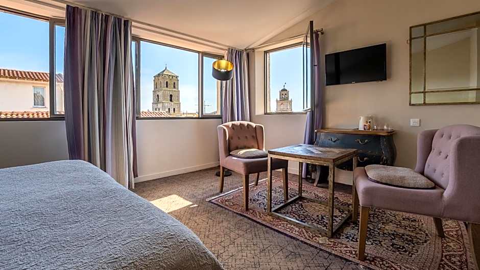 Individually decorated, this air-conditioned room features a panoramic view of the rooftops of Arles, king-sized bed, flat-screen TV, wardrobe, desk and heating. The private bathroom includes a walk-in shower, hairdryer and free toiletries.