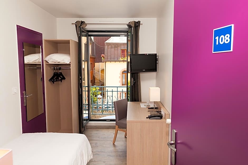 Excellent location opposite the train station. Very quiet and no noise from the trains. The look of the front view of the Hotel does not do it justice to what's inside and lovely accommodation rooms behind it. Great value for money overall. Clean rooms with heater and a large walk in shower was a bonus. Breakfast area was very clean and plenty of delicious food provided at a reasonable price. We would recommend the location and there is a bus stop opposite that a free hop on and off bus will take you up into Quimper town / village every 40 minutes.