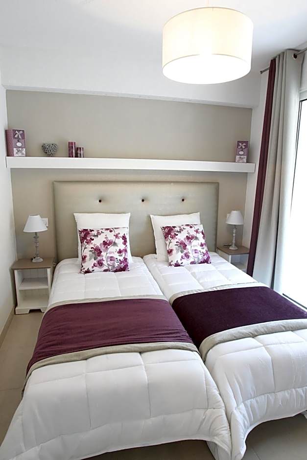 This apartment can accommodate 6 people and offers a living room with a TV and a sofa bed. There is a fully equipped kitchen with a fridge, dishwasher, ceramic hob, extractor hood, toaster, kettle, coffee maker. The 2 bedrooms each have 2 single beds which can be pushed together to make a double bed. There are 2 bathrooms, 1 with a shower and 1 with a bathtub and a separate toilet. All appartments have a balcony with garden furniture and are air-conditioned.