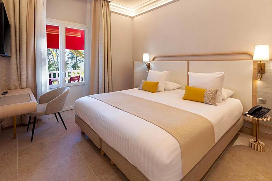 The hotel is in an exceptional location! It has a parking lot which is a must in summer in this location. Surrounded by an extensive park with big trees, It reminded me of the elegant hotels of the XXth century! It is being renovated but it preserves its grandeur, it has a charm. The rooms are not very spacious but they have a balcony with a table and chairs with view on the lawn, the big trees, the park and the quiet …… Walking distance to the beach, the Promenade Rose (the boardwalk), and its restaurants. A great pool bar where you can have the best lunch by the pool I have ever had!