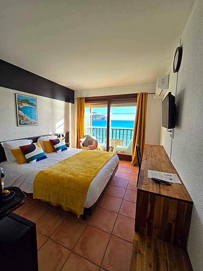 This air-conditioned room offers a magnificent view over the bay of Lecques facing the sea with a terrace, Located on the 3rd floor without elevator. It includes a mini-bar, safe, hairdryer, television, free welcome tray. The bathroom has a bathtub.