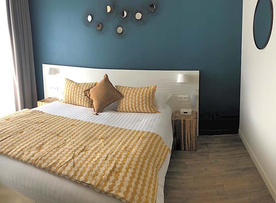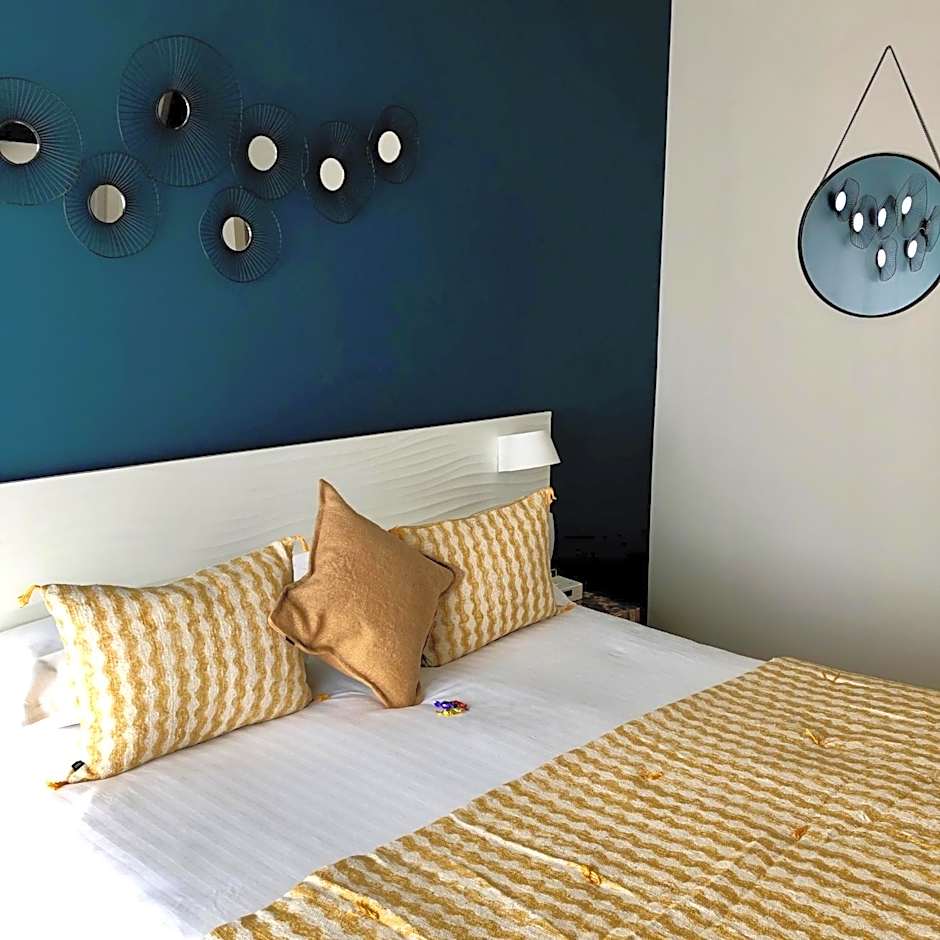 This room is decorated in shades of blue and features a dressing table. There is a terrace with two chaise longes and a small table where guests can enjoy the view of the pool and the sea. The bathroom has a shower. There is a mini-bar, a Nespresso coffee machine, a safe and satellite TV.