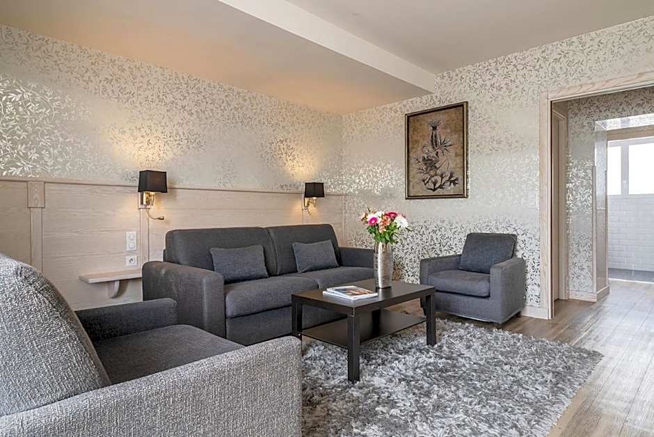 This executive room features a living room with a sofa bed as well as direct access to the swimming pool. A terrace with garden views is available upon request. The room can accommodate up to 2 adults and 2 children max. 12 years. Cette chambre dispose de la climatisation
