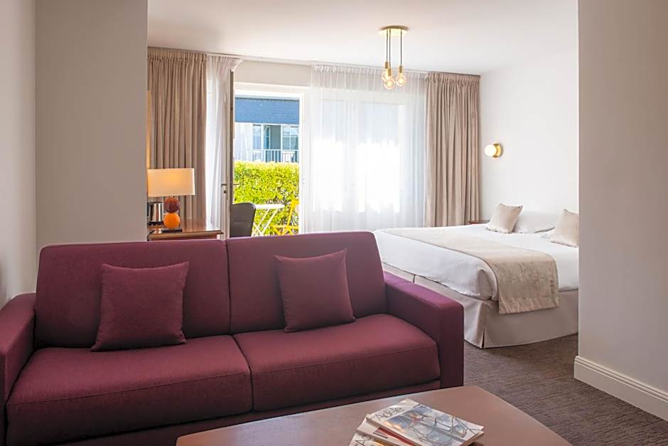 This executive room features a living room with a sofa bed as well as direct access to the swimming pool. A terrace with garden views is available upon request.
