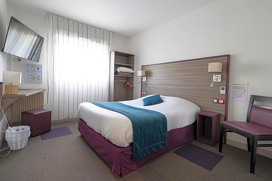 Simpel hotel close to highway. Everything little bit outdated, but room and bathroom clean. The room had airconditioning and it had no noise and you can make it fully dark. I slept very well. According to French customs, the breakfast was excellent. There is a restaurant nearby as well. You can park on a parkinglot that belongs to the hotel. Staff was very friendly.