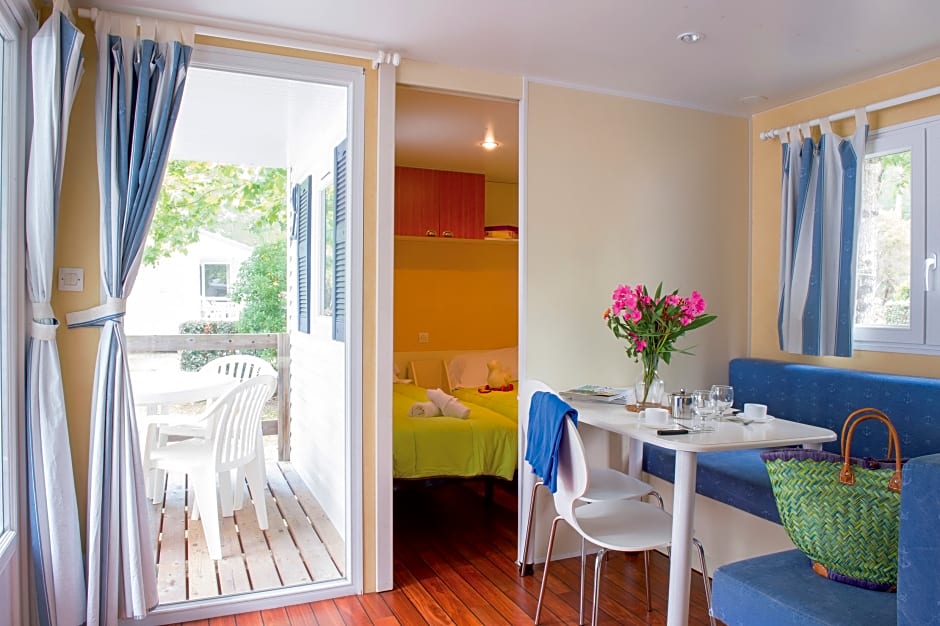 Mobile home capacity 4 is 215 square feet and includes either a double bed 131-150 width or 2 single beds 80-130 width plus terrace and tea and coffee making facilities .