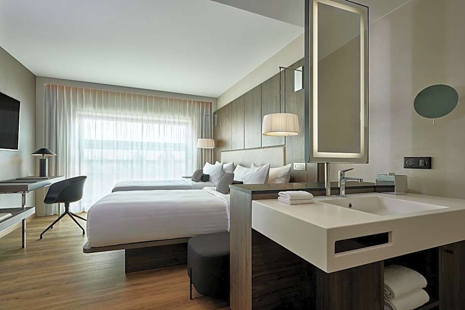 The AC Hotel by Marriott Strasbourg offers Standard Twin Rooms and Standard King Rooms. The twin rooms have two twin beds and accommodate 2 adults and 1 child, while the king rooms have a king-size bed and also accommodate 2 adults and 1 child. All rooms are non-smoking and have a size of 215 sqft.