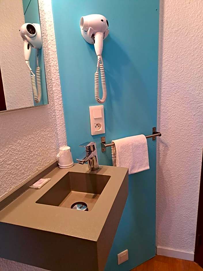 The receptionist was very welcoming and the hotel room simple but well set up. The beds were comfortable, the shower excellent with glass panels rather than curtains. The room was also equipped with a kettle and the necessary to make coffee and tea. In the entrance, a microwave was available for the clients. Breakfast was also very good, with cheese, ham, croissants, etc. The hotel is well located, near shops and restaurants. Perfect place to stop by when travelling through France.