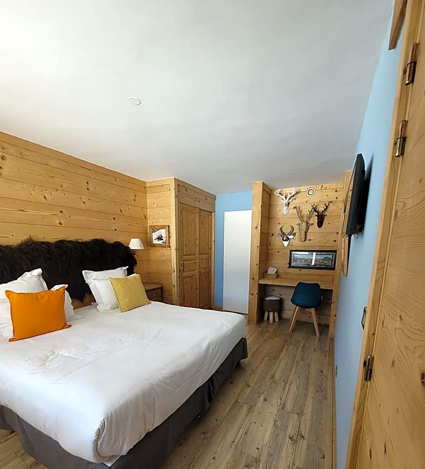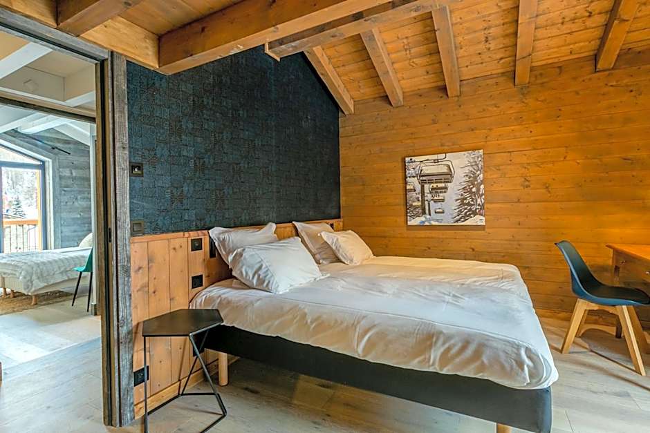 This suite is composed of 2 independent interconnecting rooms. There is a family room with 2 single beds on a mezzanine level, decorated in a treehouse style and with a ceiling height of 63 in. The ground floor of the family room has 2 single beds or a large double bed and a bathroom with a bath and a hairdryer. The interconnecting double room measures 43 feet² and has views of the mountains or village.