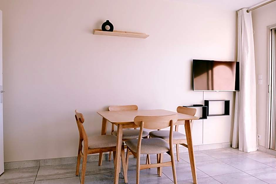 Wonderful, friendly and helpful personnel at the reception! Thank you su much for all the helpful recommendations!!! Safe teritory (parking, garden and a small pool) behind the gates. Free parking, working AC, small terrace, a kitchen. Good location - supermarket, boulangerie and a seaside are not far away.