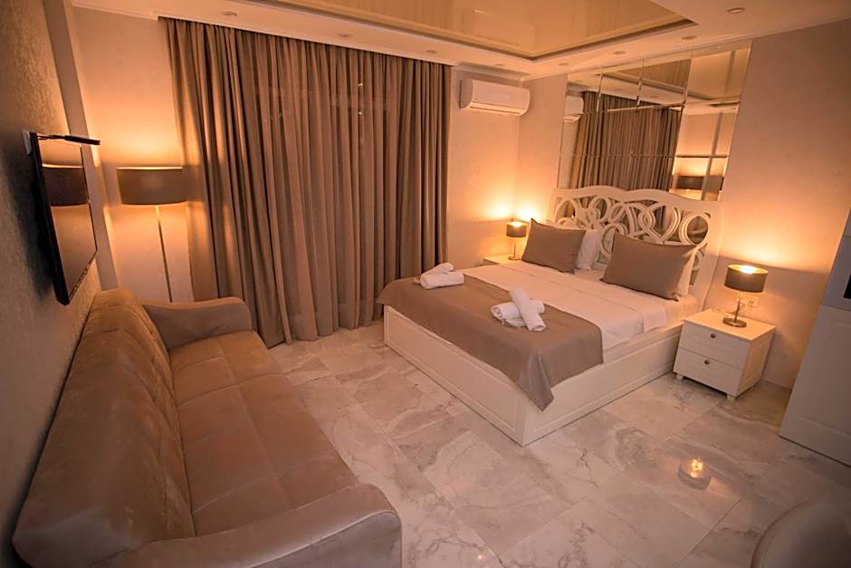 Blue Star Batumi offers a variety of apartment rooms with different sizes and accommodations. All rooms are non-smoking. The One-Bedroom Apartment and Deluxe Apartment both accommodate 4 adults and 2 children, while the Apartment with Sea View accommodates 3 adults and 1 or 2 children. Each room features different bed configurations, including king size beds and sofa beds.