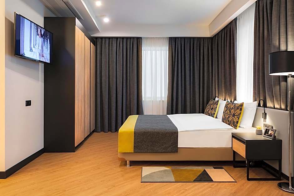 Each 36 to 45 sqm studio executive apartment is cleverly designed to cater to traveling couples or groups of six. It is fitted with a fully-equipped modern kitchenette, separate sleeping corner with a double bed, 2 double pull-out sofa beds, private bathroom and well-partitioned living and dining areas.