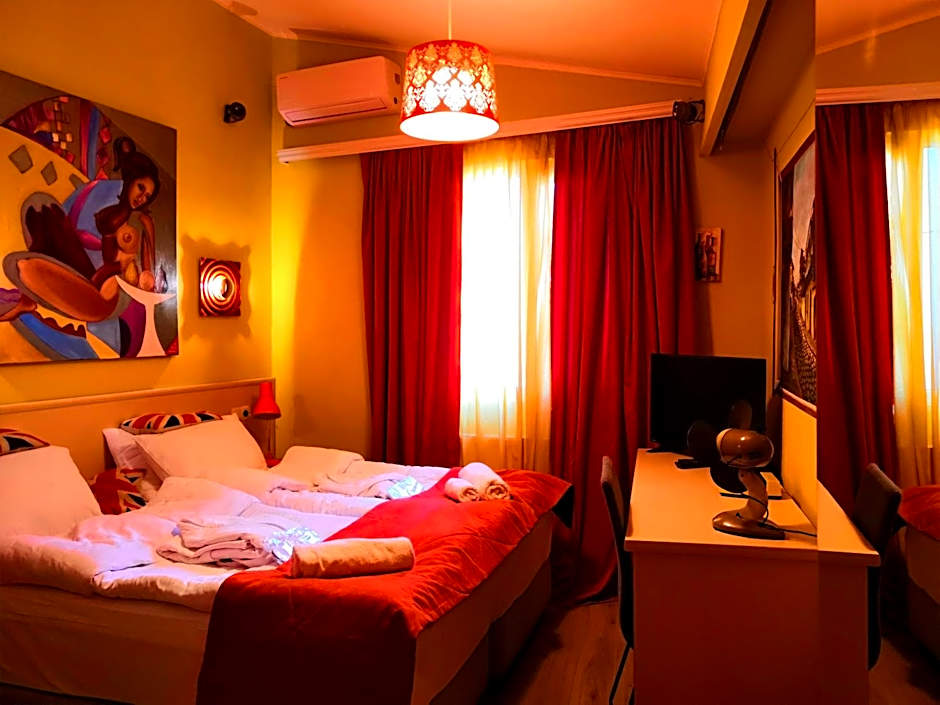 This standard room is designed in Hippie style and has double/twin beds, flat-screen TV, air conditioning, disco ball, safety deposit box, black LED lighting and fridge.