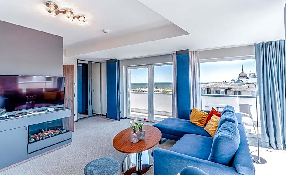 The Double room with side sea view is 30-112 ft² and has a side view of the Baltic Sea, shower/WC, Wi-Fi, flat screen TV, sitting area, room safe, gas or 3D fireplace and mini-bar. Some rooms have a balcony, air conditioning and BD.