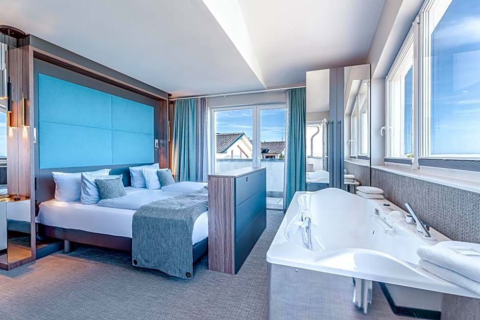 The double room with sea view is 30-148 ft² and has a balcony with sea view, shower/WC, sitting area, flat screen TV, Wi-Fi, room safe, mini-bar, gas or 3-D fireplace. Some rooms have air conditioning and BD.