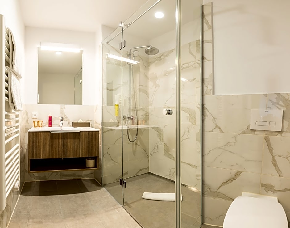 The location is very good. Close to the international congress center, 15mins walk to it through a quiet little neighborhood. Train station for the S bahn is 7 minutes by foot. Upon arrival easy self check in through an iPad. Now the rooms. They are spacious, suited for a longer stay as they have a kitchenette. Very clean. Great bathroom with fantastic shower and great water pressure. Very soft bedding but clean sheets. Lots of wardrobe space. Overall neat and spacious. Very good soundproofing. Good coffee.