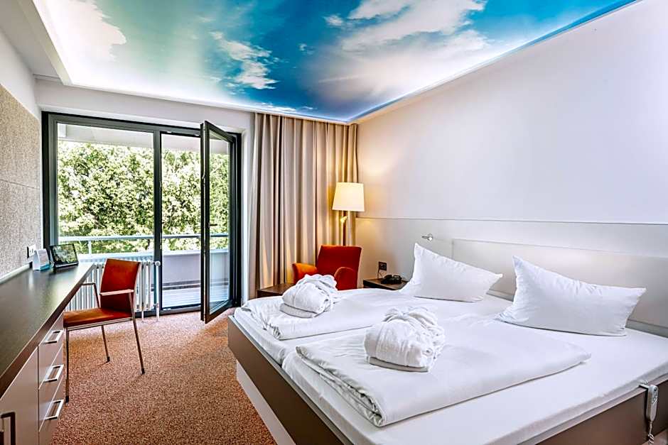 The Thermenhotel Gesundheits-Bad Buchau offers two types of double rooms: the Standard Double Room and the Double Room with Balcony. Both rooms can accommodate 2 adults and have a Queen size bed. The Standard Double Room is 269 sqft in size, while the Double Room with Balcony is slightly larger at 323 sqft. Smoking is not allowed in either room.