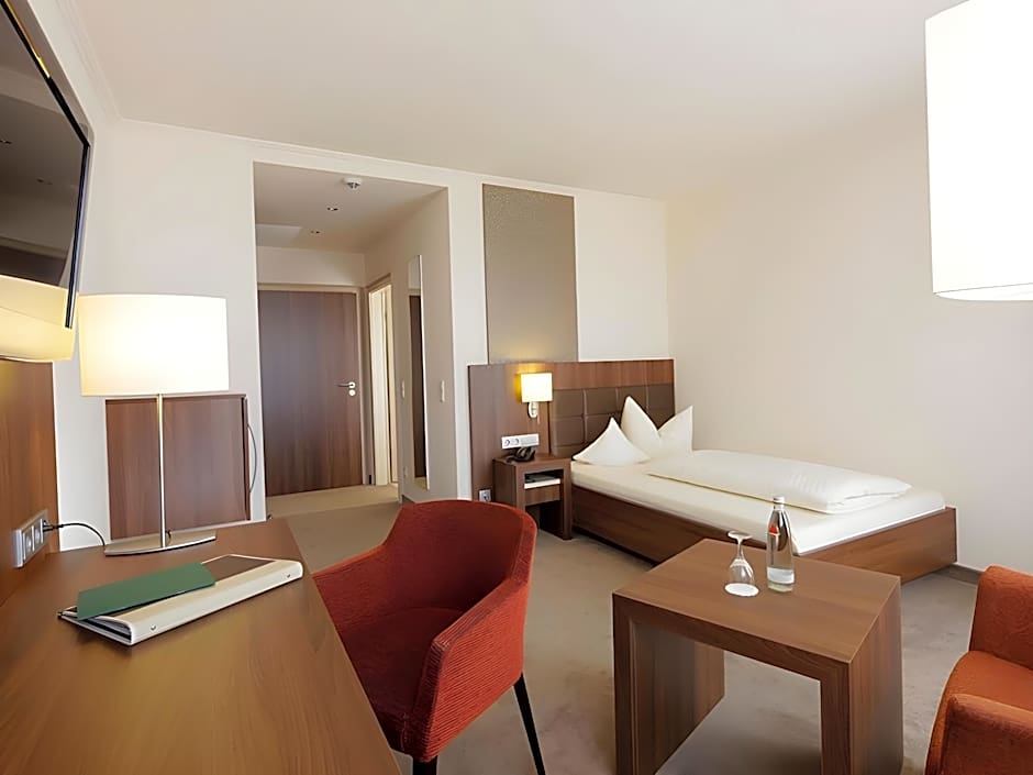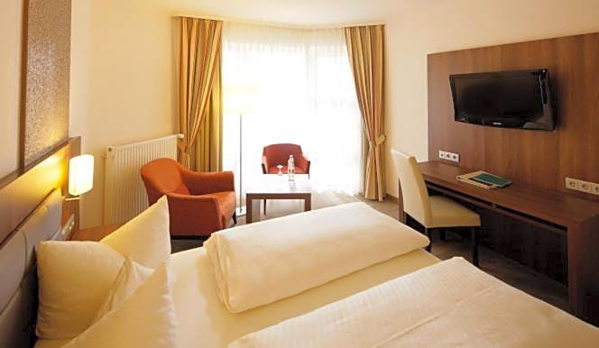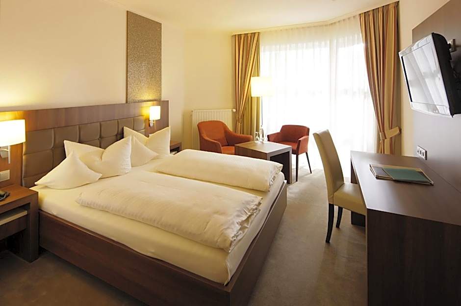 Rooms and public spaces feature garden views, balconies, terraces, and soundproof, non-smoking options. A garden setting with loungers and a patio offers outdoor seating, while elevators provide easy upper-floor access, ensuring a comfortable stay near Bad Grönenbach’s charm and the surrounding region.