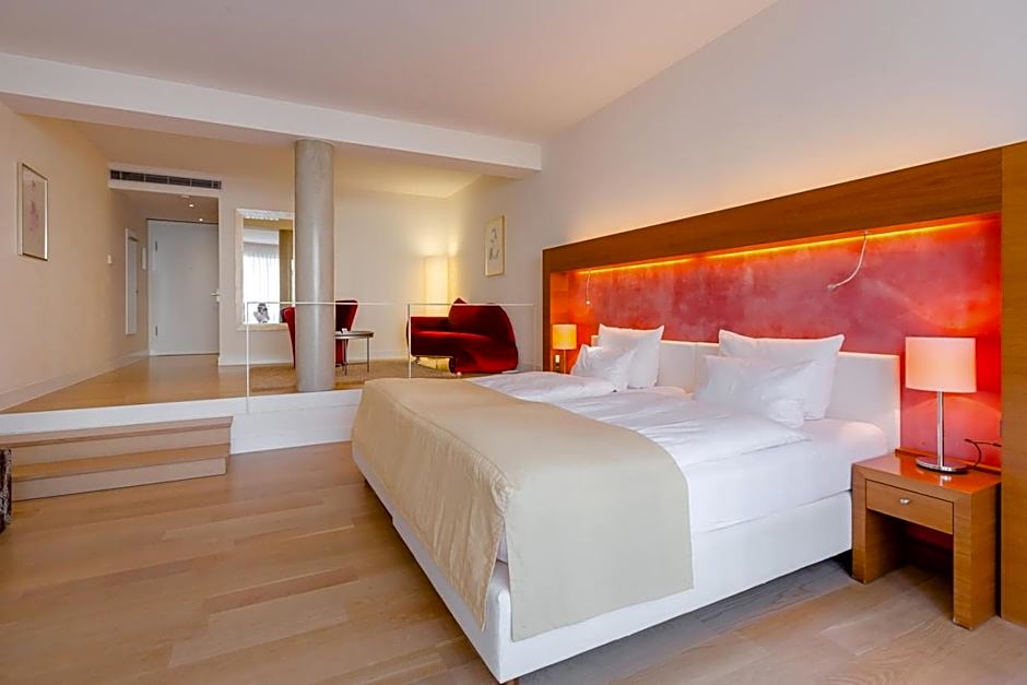 Stylish suite with a living room and separate bedroom. Features a great view of the Sophienstraße street. The TV can be rotated and watched from anywhere in the suite.