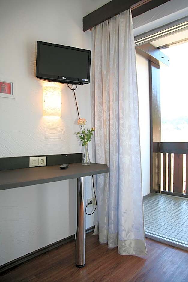 Lovely family run hotel. Huge comfortable beds, great shower with lots of choice at breakfast. Nice balcony - views do surrounding mountains and a couple of rocking chairs and a low table.Very welcoming staff. We are at the hotel the two evenings that we stayed - great choice on the menu (3 vegetarian options) and food was delicious. Nice big shady terrace for outdoor dining and drinks. Plenty of parking. Hotel had a lift.