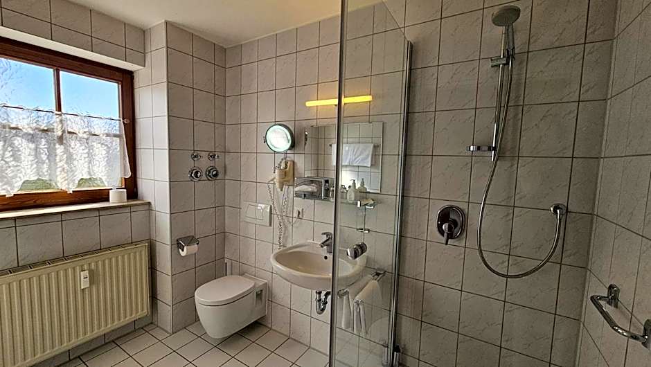 Great breakfast menu. Catered well for us vegetarians. Waitress was exceptionally friendly with her dirndl dress! Room was clean and comfortable. Wish shower & toilet were on the same floor level... guess we are not used to stepping up to a toilet or a shower.