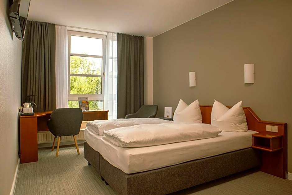 Spacious and light-flooded room with a coffee tea station, a desk, telephone and a private bathroom with shower and hairdryer. WiFi and landline calls within Germany are free of charge.