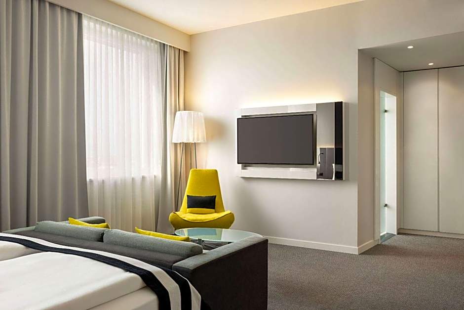 Free highspeed Wi-Fi - Sat TV - Coffee & tea making facilities - Safe with power socket - Air conditioning - Bathroom with WC, shower/bathtub & underfloor heating - Desk, lounge chair and/or couch - Free digital newspapers and magazines Spacious living comfort on 32 m² in black and white with a stylish relax corner, accentuated with yellow color nuances. The bright bathroom with large mirror, a sofa and/or armchair offer Berlin explorers’ free space and a living room atmosphere. The Deluxe rooms are equipped with twin or king-size beds.