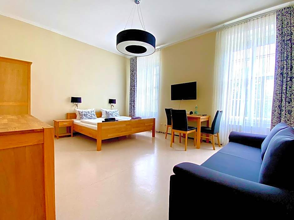 Ideal starting point for visiting the old part of the town, close to numerous restaurants and cofee bars, but at the same time close to trams and busses connecting to the other part of the city. You can pop up to Albertinum in 1 min walk! In nice weather you can dine on the terrace full of pots with beautiful flower arrangements. Very nice boss and helpful staff. In the kitchen you can make coffee or tea and heat meals in the microwave. My room was large and the beds were comfortable. It was very clean everywhere in spite of rainy weather.