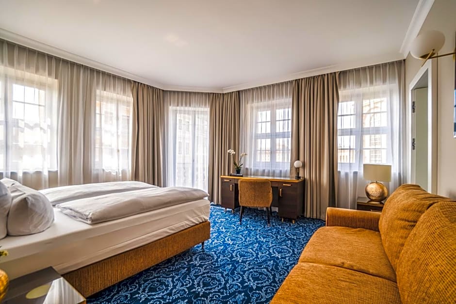 This elegant suite features 19th-century style furniture and an Italian marble bathroom. This room showcases a historic Dresden design and a combined living and sleeping area.