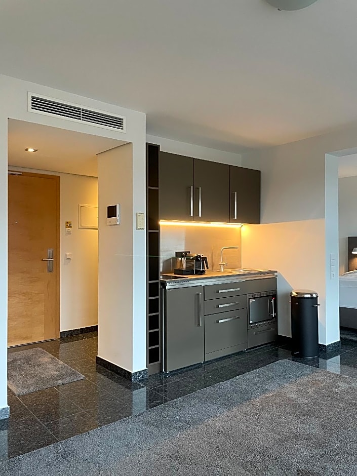 The apartment house is close to the airport (20 minutes by walk) and very close to the S-bahn (4 minutes). The room was quite big and the bed also. The kitchen was well-equipped. I liked the fully digital key for entering the building, the corridor and the room itself. Rare but not surprising in Düsseldorf, the vending machine on the corridor sells Killepitsch also.