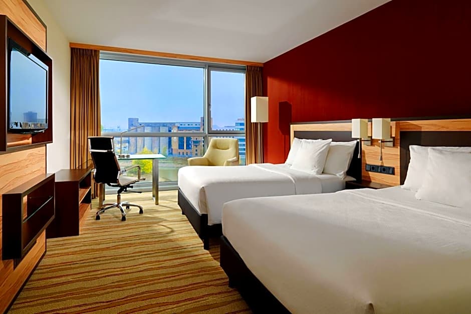 This spacious and bright room offers a view of the Media Harbor. It features a flat-screen TV with satellite channels and an entertainment program. There is also an aerodynamic work desk. Other extras include tea and coffee making facilities and a safe.