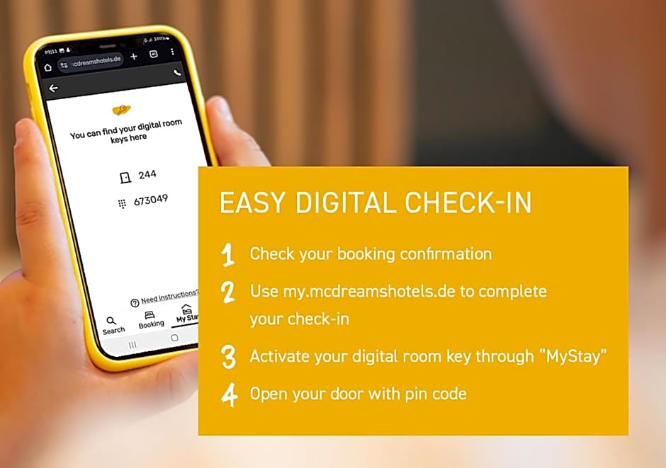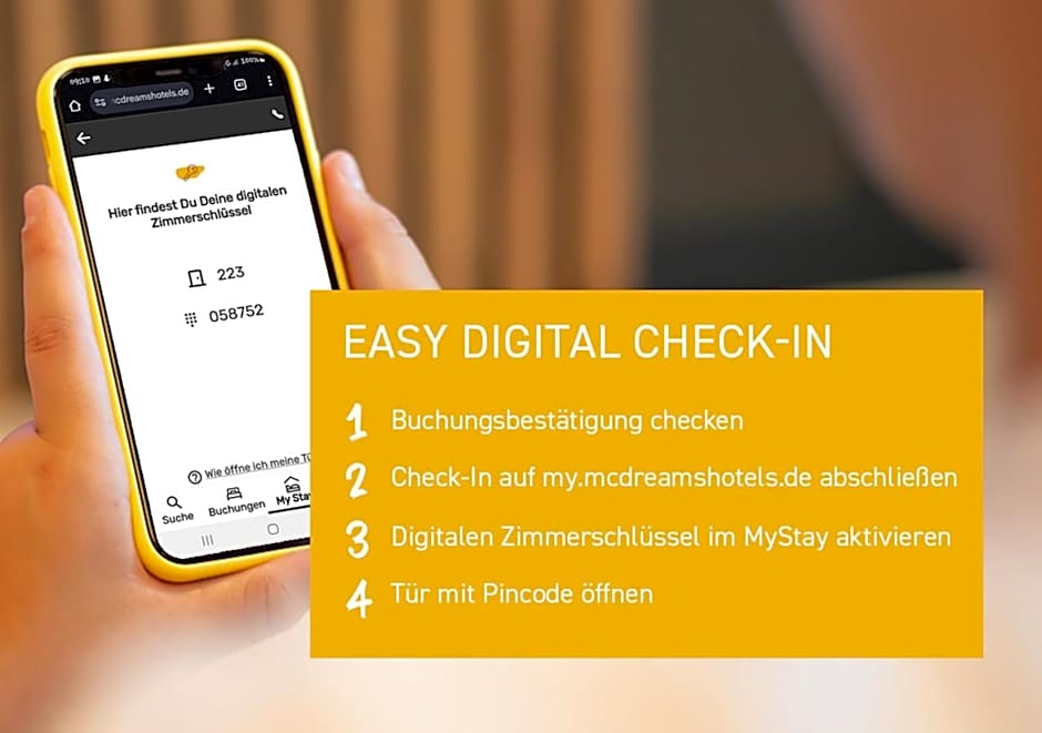 Your reservation at McDreams Hotel Düsseldorf-City specifies a check-in timeframe of 15:00 to 21:00, and a check-out deadline of 11:00.